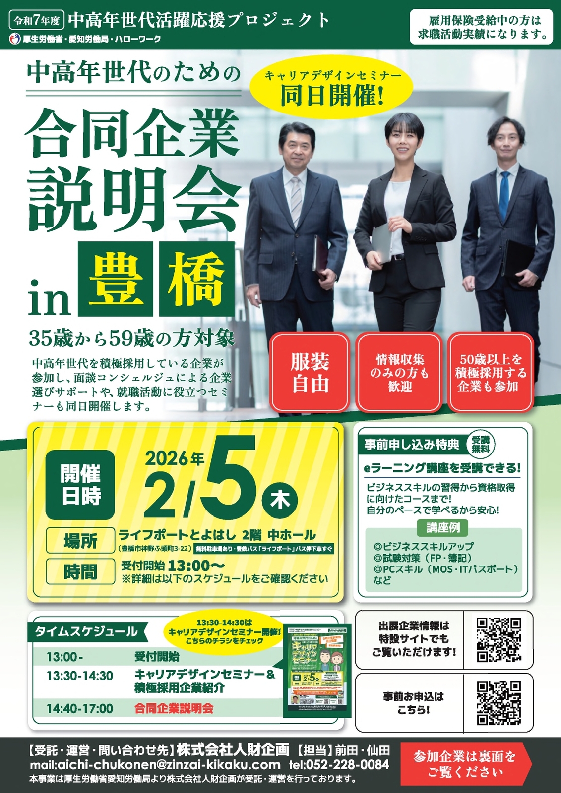 愛知県では、長年培った経験や能力を活かすことを望むシニアと、企業とのマッチングの機会を提供するため、シニアを対象とした合同企業説明会を開催しています。